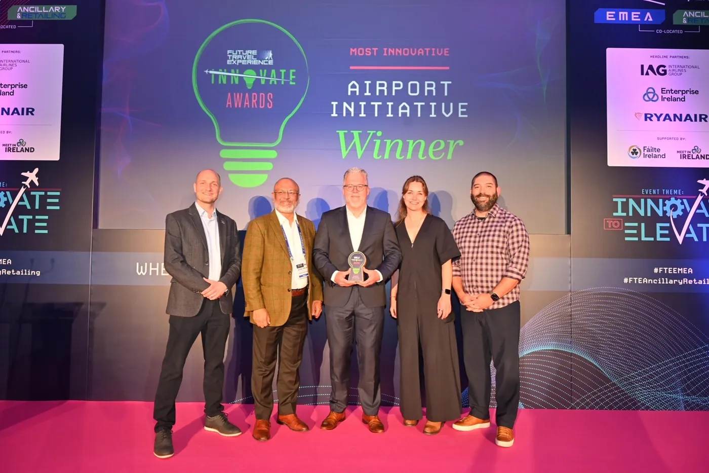 © Flughafen Berlin Brandenburg GmbH In the photo (from left to right): Ryan Ghee (Future Travel Experience), Javed Malik (Formerly AirAsia Group & BLR Airport), Christian Draeger (BER Berlin Airport), Rahel de Vriend (The Next Web - TNW), Kevin Kleist (Southwest Airlines)